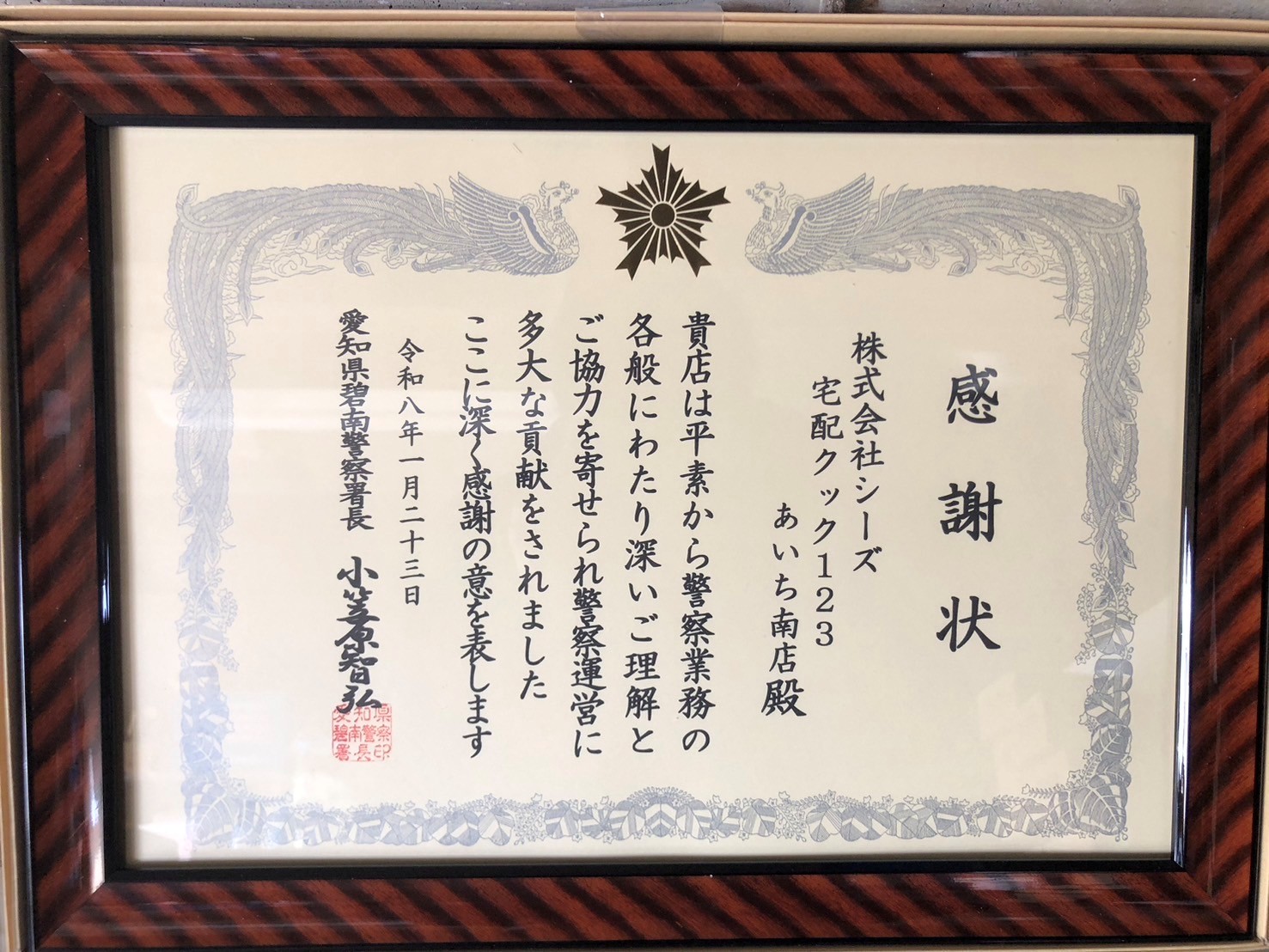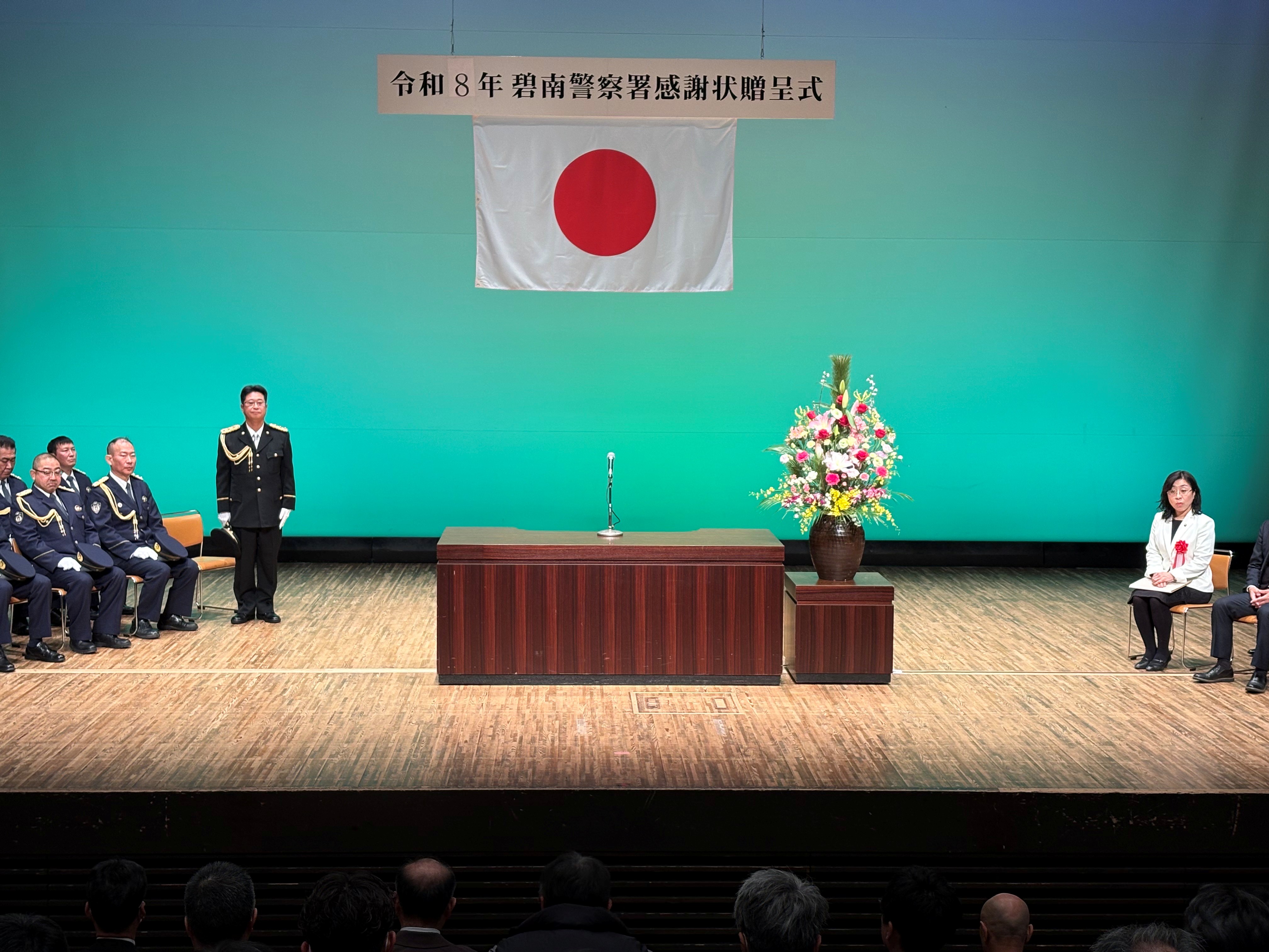 地域の防犯活動への協力が評価され、碧南警察署より感謝状を贈呈されました。